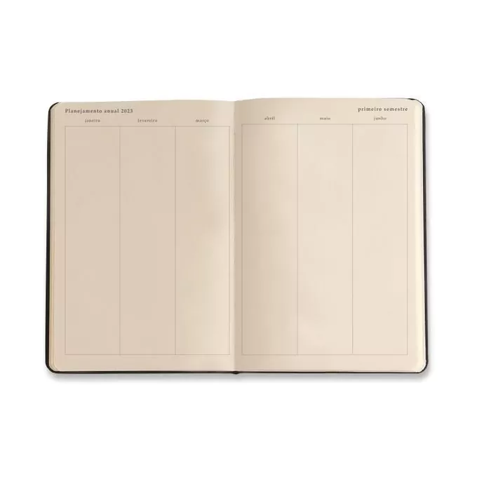 visão anual no início de todas as agendas, planejamento anual em 4 páginas, páginas de anotações, planejamento financeiro com uma dupla com entradas, gastos e balanço de cada mês, páginas com objetivos para o ano e visão mensal no início de cada mês